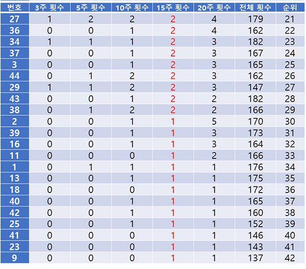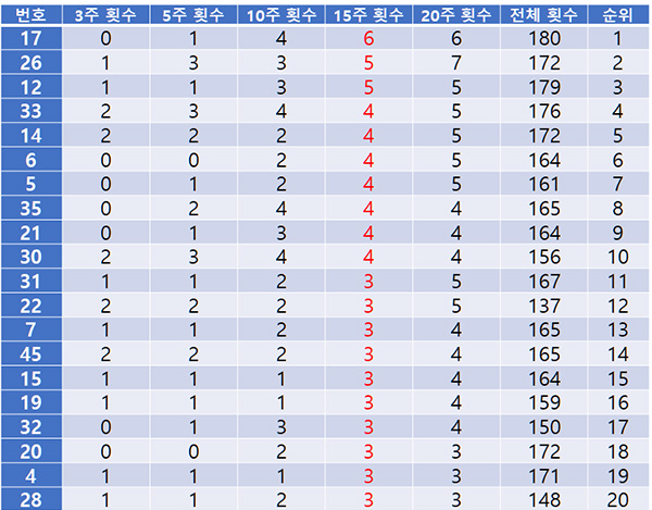 15주라는 장기간 동안 많이 당첨된 로또번호를 찾았습니다.