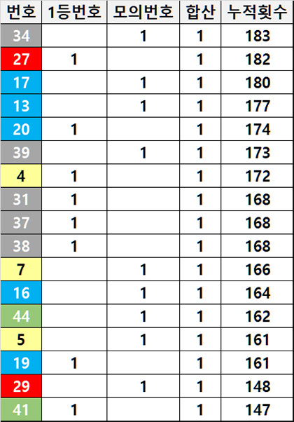 45개 로또번호를 1등 번호와 모의 번호로 분리해서 출현횟수를 집계하고, 두 집계한 값을 합산한 값도 분석했습니다.