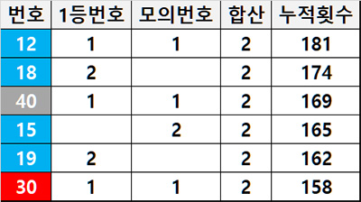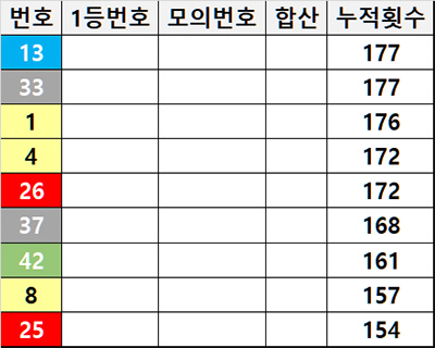합산 1회는 1등 번호와 모의번호 어느 한쪽에만 5주 동안 한번 나왔다는 숫자인데, 이 숫자 중에서는 누적횟수로 가능수를 판별합니다.