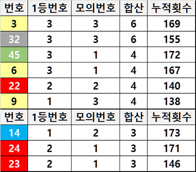 3번은 1등 번호에서 3회 나왔고, 모의번호에서 3회 나와서 총 합산 6회 출현한 번호입니다.