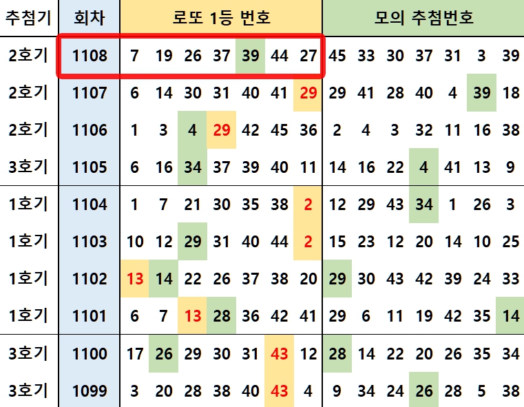 로또 1108회 당첨 번호 조합을 분석했을 때, 아래처럼 직전 1107회 로또 당첨번호에서는 일치수가 없었고, 모의추첨번호에서 39번이 일치했습니다.