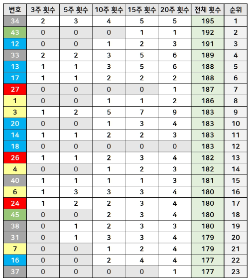 1번은 주로 겨울철에 자주 나오는 경향이 있어, 계절적 특성을 반영한 번호 선택 시 유용합니다. 3번과 20번은 각각 183회 출현하여, 다양한 번호 조합에서 중요한 역할을 할 수 있습니다.