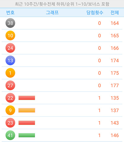 반대로 10주 동안 당첨되지 못한 번호들은 다음과 같이 당첨횟수 0인 숫자들이죠.