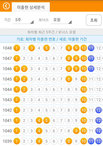 5주 미출현 상세 내역은 다음과 같은데, 어떤 번호들이 계속 미출현 상태인지, 출현 상태인지 확인 되죠.