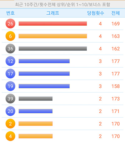 최근 10주간 최다 당첨횟수를 기록한 번호는 26번 6번 36번인데, 10주 4회 당첨 되었습니다. 3회 당첨된 번호들은 다수 확인됩니다.
