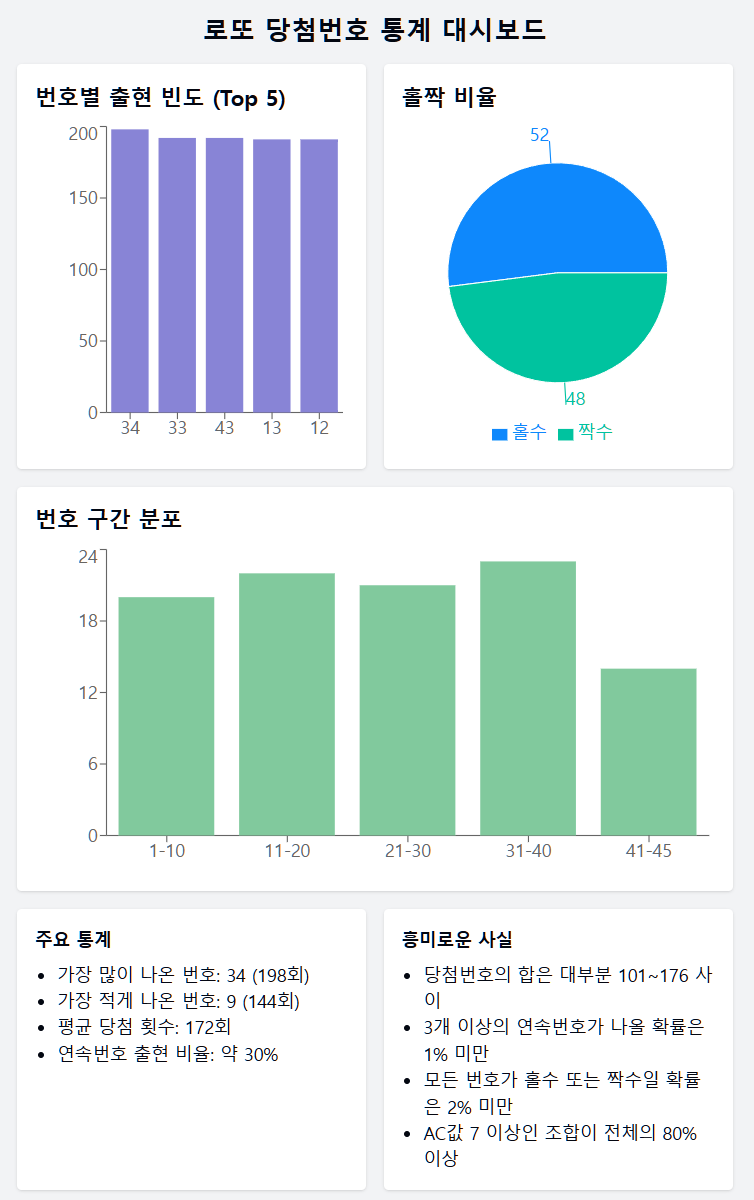 1136회 로또 당첨 예상번호를 분석하면서, 늘 궁금해하던 로또 당첨번호의 비밀에 대해 이야기해 볼까 해요. 혹시 "로또 번호에도 뭔가 특별한 패턴이 있지 않을까?" 하고 생각해 보신 적 있나요? 저도 그랬어요. 그래서 이번에 역대 로또 당첨번호를 쭉 분석해 봤답니다. 제가 만든 특별한 대시보드와 함께 그 결과를 여러분과 공유하고 싶어요.